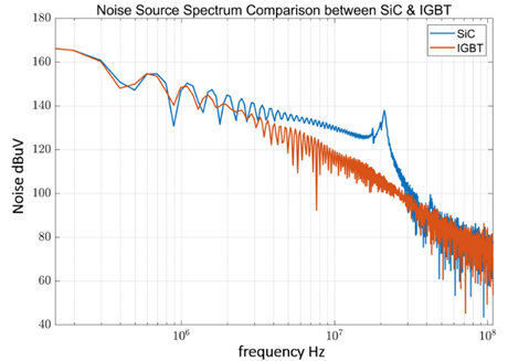 圖2  重復性脈沖頻譜對比,相較IGBT可看到由于SiC高速開關帶來的MHz級幅值抬升,以及振蕩帶來的20MHz左右頻譜尖峰