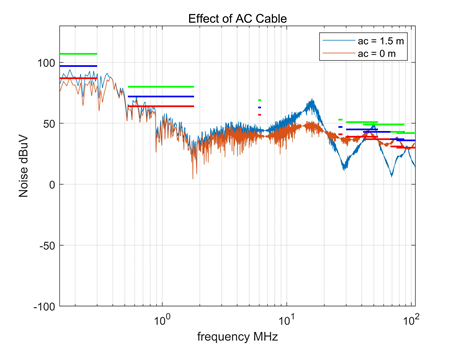 圖3  基于單電控的噪聲頻率對比,AC側采用直插形式后可觀察到原長線纜帶來的高頻行波振蕩消除