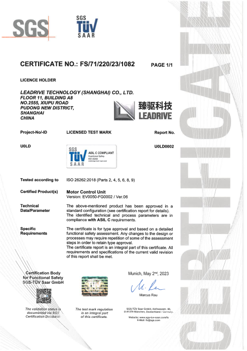 近日,國際權威第三方審核認證機構SGS為臻驅科技(上海)有限公司(以下簡稱“臻驅科技”)頒發ISO 26262:2018 ASIL C汽車功能安全產品認證證書,該證書是臻驅科技獲得的首個功能安全產品認證證書,也是繼2021年7月獲得“ISO 26262:2018 ASIL D汽車功能安全流程認證證書”后,在汽車功能安全產品開發能力建設的又一重大里程碑。